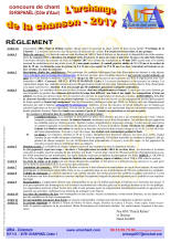 Pour cette 17e édition, il y aura 3 sessions différentes : Juniors (8-14 ans), Espoirs (15-20 ans) et Adultes/seniors (+ de 21 ans). Comme l'an dernier, les candidats pourront opter, s'ils le désirent, pour une chanson en langue étrangère, mais, attention la première chanson interprétée sera obligatoirement la française et elle ne sera écoutée que sur 2 minutes. Rappelez-vous que vous pouvez aussi prendre deux chansons en français ! Voilà, tout est dit ! Il ne vous reste plus qu'à télécharger ci-dessous le règlement et passer à la page Les inscriptions. Nous vous souhaitons bonne chance et attendons votre fiche d'inscription. Attention, le nombre de candidats est limité à 60 par journée (toutes catégories confondues).